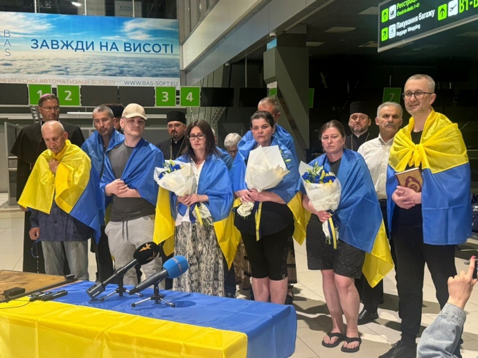 Дослівно: "Наріман Джелял, Валерій Матюшенко, Олена Пєх, Богдан Гелета, Іван Левицький, Микола Швець, Наталія Захаренко, Павло Купрієнко, Людмила Гончаренко та Катерина Брюханова. Звільнені з російської неволі українці вже у Києві.