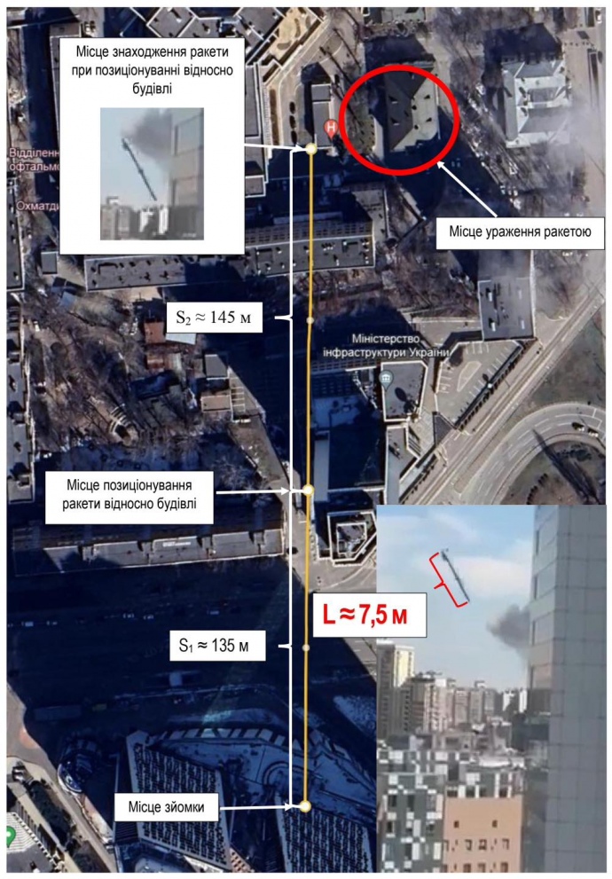 За наявним в розпорядженні експертів КНДІСЕ відео влучання ракети в дитячу лікарню "Охматдит", зроблено орієнтовний розрахунок розміру крилатої ракети – 7,5 метрів.
