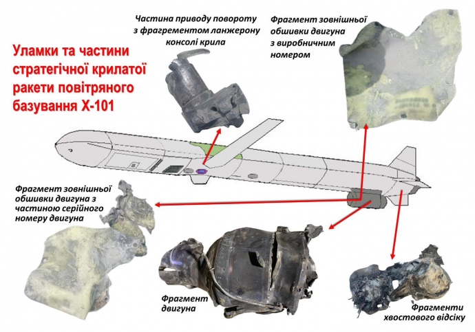 Пряма мова заступника міністра юстиції Андрія Гайченка: "Специфічні інженерно-конструкторські особливості знайдених уламків та відповідні типові маркування свідчать про застосування збройними силами Російської Федерації стратегічної крилатої ракети повітряного базування типу Х-101. Її довжина складає 7,5 м, бойова частина – близько 400 кг, максимальна швидкість – 720 км/год, дальність польоту – до 5000 км".
