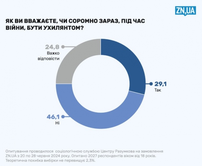 Деталі: Видання запитало, чи соромно нині, під час війни, бути ухилянтом? 46% українців уважають, що бути ухилянтом не соромно. І лише 29% дотримуються протилежної думки, 25% — виявилося важко відповісти.