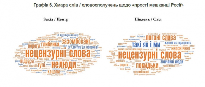 На словосполучення "прості мешканці Росії" українці можуть відповісти нецензурною лексикою, а також словами "нелюди", "зазомбовані", "неосвічені", "вороги", "тупі" і "звичайні люди".