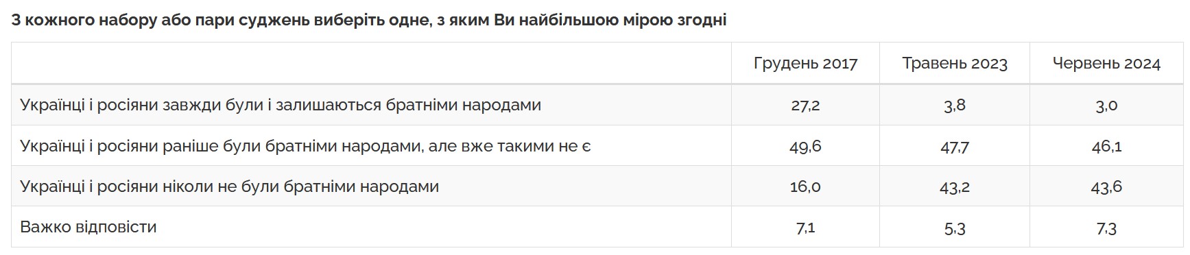 Із першим судженням ("українці і росіяни завжди були і залишаються братніми народами") у 2017 році погодилися близько 27% опитаних, у 2024 її поділяють лише 3%.