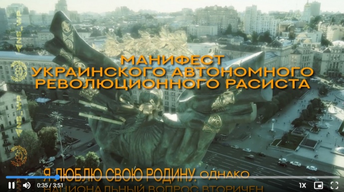 Довгий текст іде рухомим рядком на тлі краєвидів Києва. Його суть у тому, що "не повинно бути ніякої війни, крім расової", яку автор пропонує вести всім разом. Також у ньому обіцяють "покарати всіх, хто продавав країну після Майдану".
