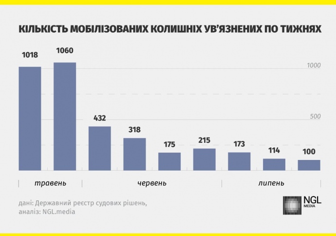 Дослівно: "Аналіз судового реєстру показує, що за три місяці такою можливістю (звільнення в обмін на військову службу – ред.) уже скористались 3611 засуджених. Це більше 13% від загальної кількості в’язнів в українських колоніях (за даними Мін’юсту, станом на 15 травня в українських колоніях і тюрмах перебували 27471 засуджених). Загалом уряд розраховує на мобілізацію не менше 4 тис. засуджених, раніше заявляв міністр юстиції Денис Малюська. Це фактично повноцінна окрема бригада ЗСУ".