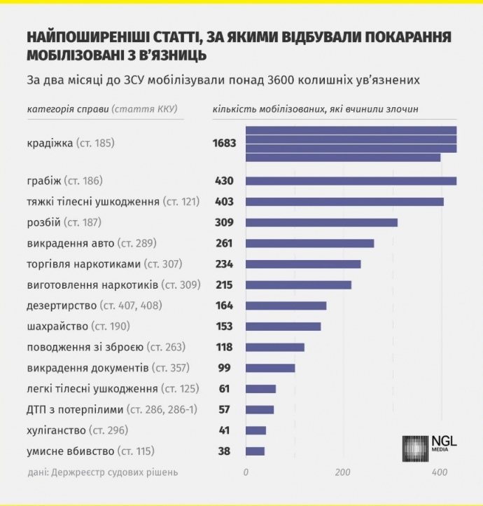 "Якщо аналізувати характер злочинів, вчинених уже колишніми в’язнями, то абсолютна більшість з них були засуджені за крадіжки, грабежі, розбої чи тяжкі тілесні ушкодження – у тому числі і такі, що спричинили смерть потерпілого. Майже усі вони служитимуть виключно на стрілецьких посадах. Судячи з судових ухвал, лише кілька звільнених служитимуть санітарами, кухарями чи водіями", - йдеться у тексті.