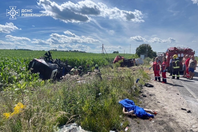 Внаслідок зіткнення маршрутки з автоцистерною в Рівненській області в суботу загинуло 14 осіб, серед них 6-річна дитина, вижила одна жінка.