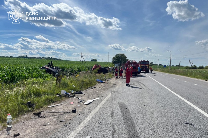 Оновлено: Пізніше Офіс генпрокурора уточнив, що внаслідок ДТП на Рівненщині загинули водії обох транспортних засобів, а також 12 пасажирів мікроавтобуса, серед яких 6-річний хлопчик. За життя однієї жінки, жительки міста Нетішин Хмельницької області, борються лікарі.