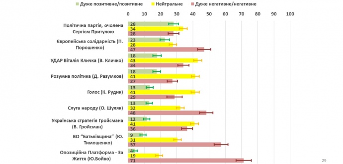 Серед дев′яти політичних партій, найбільше негативне ставлення в українців до "Слуги народу", "Батьківщини" та забороненої ОПЗЖ, найбільш позитивне - до партії Сергія Притули.