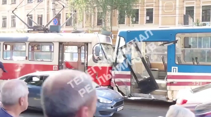 У соцмережах повідомляють, що у трамвая відмовили гальма, він розбив близько 10 машин і врізався в інший трамвай.