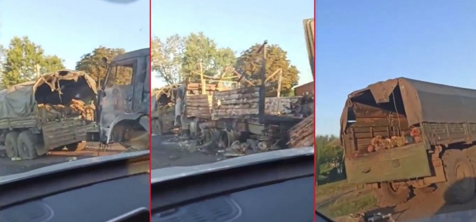 Аналітичний проєкт DeepState опублікував відео, відзняте росіянином, на якому видно розбиту колону машин збройних сил РФ зі знищеним особовим складом у селі Жовтневе Курської області РФ.