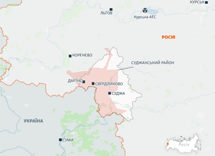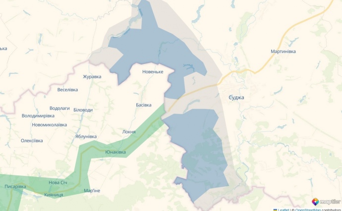- Журналісти геолокували відео, яке опублікували вранці 12 серпня російські джерела, і встановили, що на ньому українська військова техніка проїжджає через село Гир'ї Бєловського району Курської області – це приблизно у 30 км на південний схід від міста Суджа, в напрямку якого українські війська рухалися раніше
