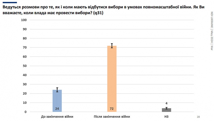 Деталі: 72% українців вважають, що проведення виборів – це післявоєнна справа, 24% воліли би голосувати під час війни.