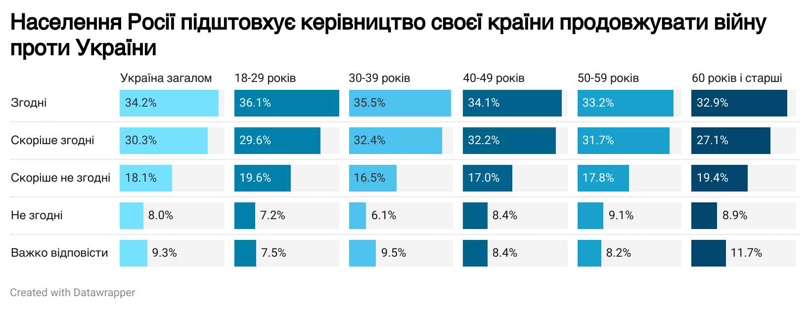 Деталі: При цьому 64,5% респондентів згодні з тим, що населення Росії підштовхує керівництво країни-агресора до продовження війни проти України.