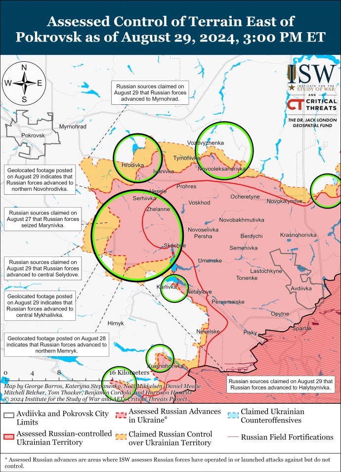 - Російське військове командування, ймовірно, прагне досягти обох цих тактичних цілей, перш ніж розпочати більш ресурсномісткі зусилля із захоплення самого Покровська, хоча російські війська можуть розпочати міські бої в Покровську незалежно від цього, якщо прогрес у цих підготовчих зусиллях зупиниться.