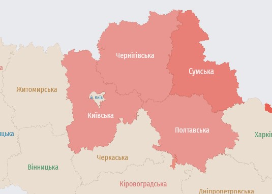 Згідно з онлайн-мапою, на Сумщині, Чернігівщині, Полтавщині та Київщині зараз оголошено повітряну тривогу.