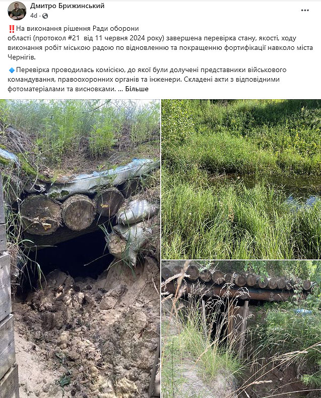 Пряма мова в.о. мера: "Після введення у Чернігові міської військової адміністрації, у травні 2023 року, її начальник, оглянувши лінію споруд, оцінив їх високу якість та дав доручення військовим, під його наглядом, вдосконалити лінію оборонних споруд довкола міста. На жаль, минулого тижня ми побачили результат цього "вдосконалення" на фото в деяких пабліках. Не вважаю, що це питання варто обговорювати публічно, але, якщо його вже підняв начальник МВА, то наголошу – Рада оборони області повинна розглянути не тільки питання споруд, а й відповідності Брижинського займаній посаді, який взявся "вдосконалювати" оборонні споруди, якість спорудження яких отримала високу оцінку".