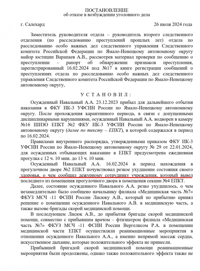 "Засуджений Навальний О.О. 16.02.2024 в період перебування в прогулянковому дворі №2 ЄПКТ відчув різке погіршення стану свого здоров'я, про що повідомив черговому працівнику установи, який вивів останнього з приміщення прогулянкового двору до приміщення секції №4 ЄПКТ.