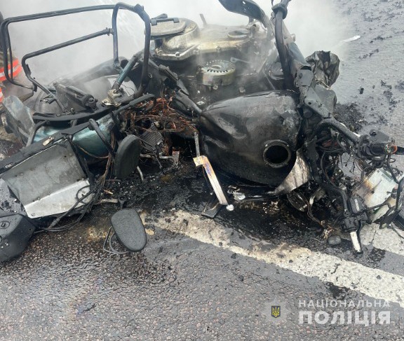 Унаслідок зіткнення мотоцикл загорівся, його водій загинув.