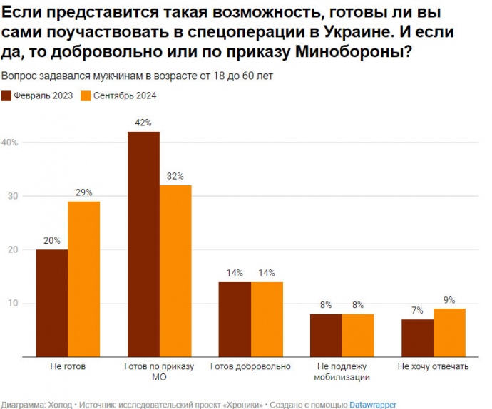 Також повідомляється, що дедалі менше росіян готові воювати. Зокрема, з лютого 2023 року до вересня 2024 року на 9 відсоткових пунктів зросла кількість тих, хто не готовий іти на війну – ні добровільно, ні за наказом Міноборони РФ. Також на 10 відсоткових пунктів знизилася частка тих, хто ще півтора року тому був готовий іти воювати, якщо мобілізують.