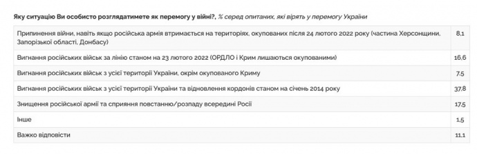 Ще 17,5% вважають перемогою знищення російської армії та сприяння внутрішньому повстанню або розпаду Росії. 17% називають перемогою відновлення статус-кво станом на 23 лютого 2022 року, 7,5% – вигнання російських військ з усієї території України, за винятком окупованого Криму, а 8% – завершення війни, навіть якщо російська армія залишиться на захоплених після 24 лютого 2022 року територіях.