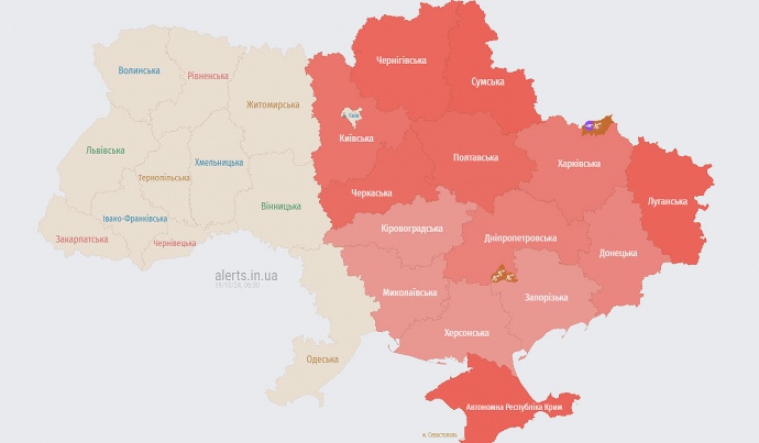 Станом на 2:45 повітряна тривога оголошена у столиці, Київській, Чернігівській, Сумській, Черкаській та Полтавській областях.