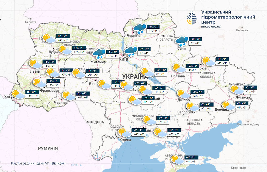Деталі: У Києві в середу вночі без опадів, -5°-7°, вдень місцями невеликий мокрий сніг, -1°+1°, вітер північно-західний, 3-8 м/с.