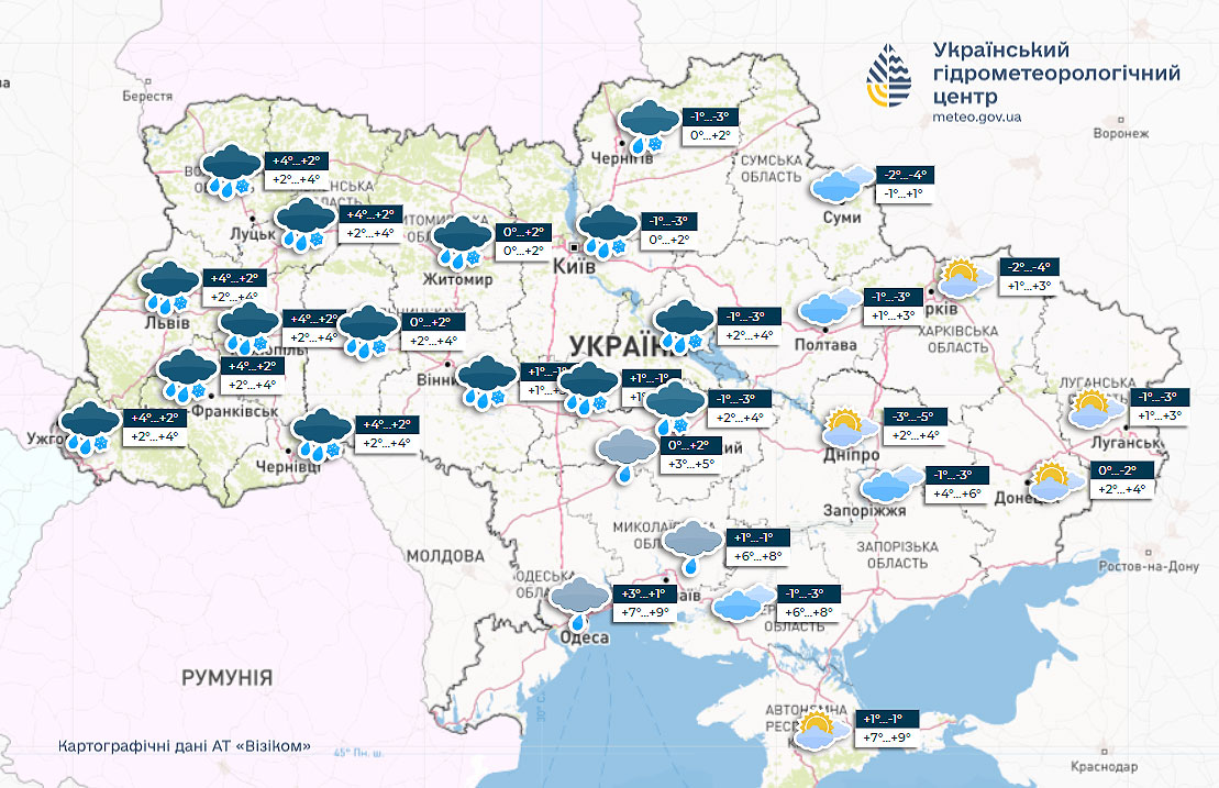У найближчі дні в Україні місцями очікується мокрий сніг