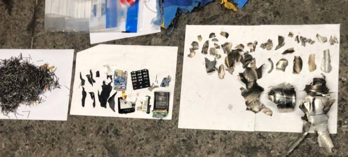 Криміналісти та вибухотехніки поліції вилучили з місця події залишки вибухового пристрою, серед якого були й цвяхи, як вражаючі елементи, рештки мобільного телефону та відеокамера дистанційної передачі зображення.
