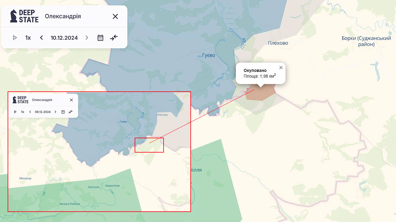 Ці зміни відображені за 10 грудня. Згідно з картою Deep State, станом на 9 грудня териорія поблизу Олександрії була під контролем України.