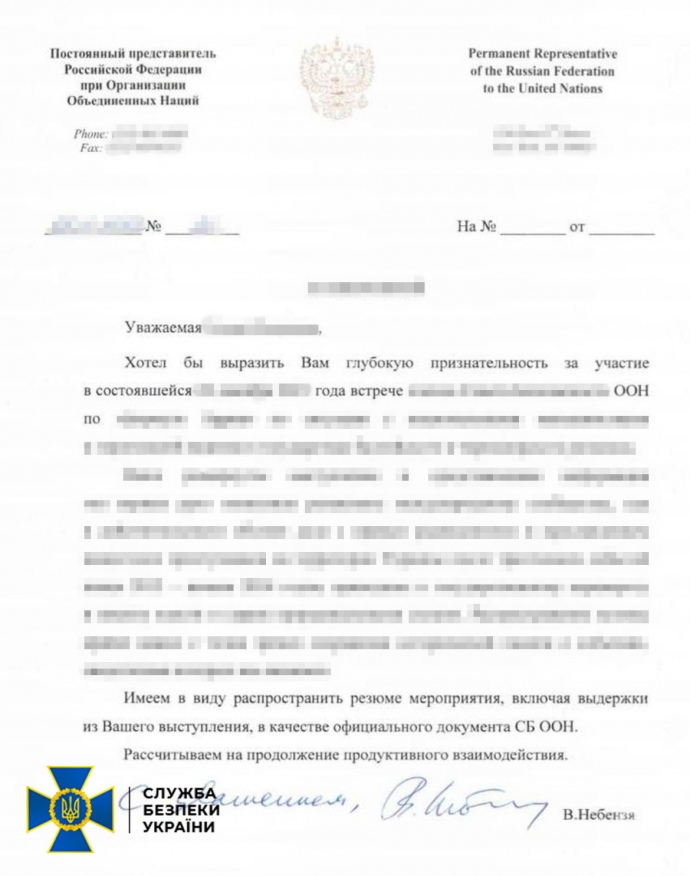 У лютому 2022 року жінка, отримавши завдання від кураторів в РФ, підготувала лист на ім’я постійного представника Росії при ООН Небензі, в якому із застосуванням маніпулятивних технологій розповіла про події, які нібито відбуваються у Києві та в Україні, виправдовуючи таким чином військову агресію росіян.