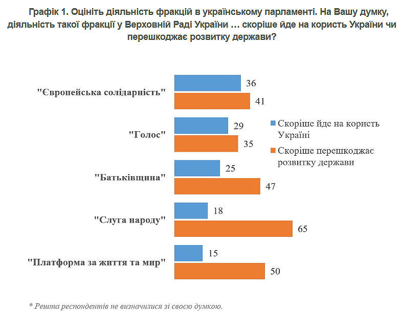 Дослівно КМІС: "У випадку всіх фракцій більше тих, хто вважає, що ця фракція перешкоджає розвитку держави, ніж тих, хто вважає, що її діяльність йде на користь України. Відносно найкраще респонденти оцінили діяльність фракцій "Європейська солідарність" (36% вважають, що її діяльність іде на користь Україні проти 41%, які вважають, що, навпаки, перешкоджає розвитку) і "Голосу" (29% проти 35%). Далі йде фракція "Батьківщини" (25% проти 47%)".