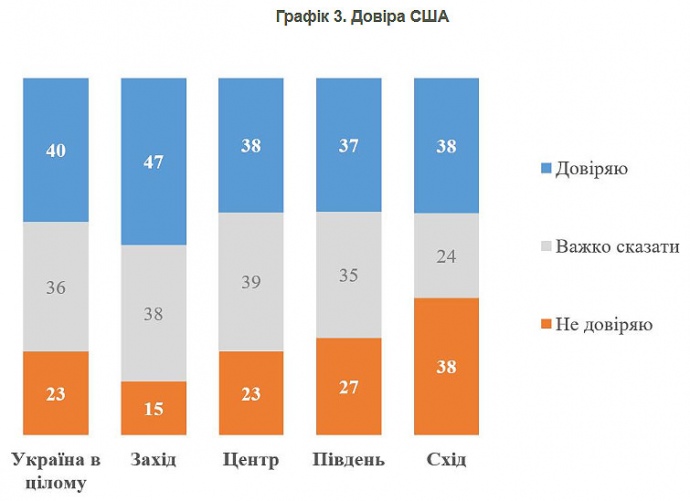 Дослівно КМІС: "Довіряють США – 40%, не довіряють – 23%. Решта 36% мають невизначене ставлення (тобто в чомусь довіряють, у чомусь – не довіряють".