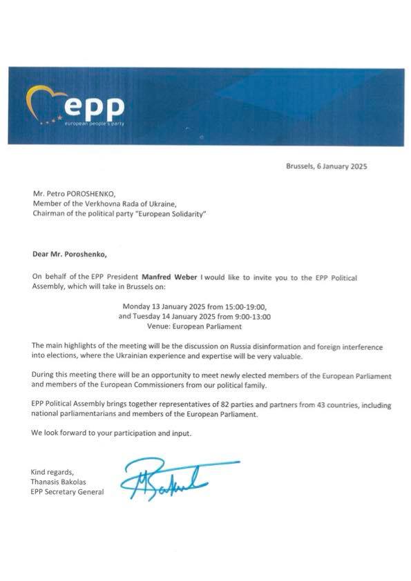 Стефанчук також оприлюднив запрошення для Петра Порошенка за засідання Європейської народної партії.
