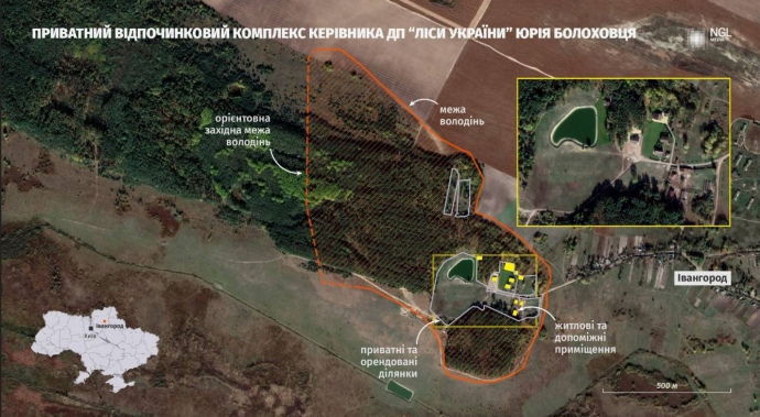Керівник ДП "Ліси України" Юрій Болоховець та його оточення на землях біля лісу на Чернігівщині на околиці села Івангород побудували маєток із будинками, озером, конюшнею та вольєрами для тварин.