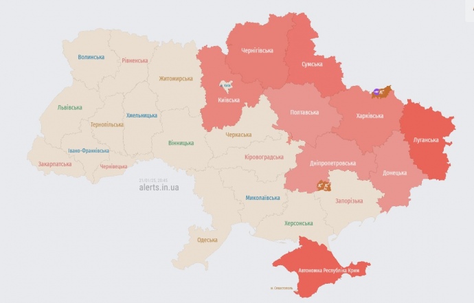 Станом на 20:45 повітряну тривогу в столиці скасували, проте вона лишилася в Київській області та північно-східних регіонах країни.