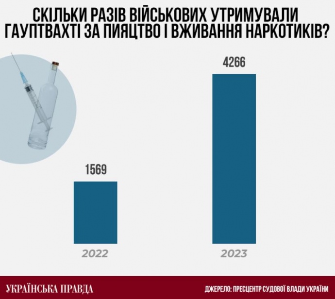 За офіційними даними пресцентру судової влади, впродовж 2022 – 2023 років 5835 українських військових відсиділи на гауптвахті від 10 до 15 діб за вживання алкоголю або наркотиків.
