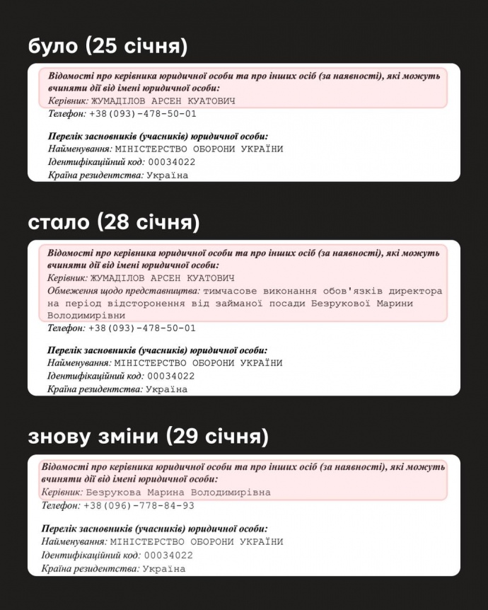 Деталі: За даними YouControl, зміна відбулася 29 січня, а до того з 25 січня керівником АОЗ в держреєстрі значився Арсен Жумаділов, який очолює іншу спеціалізовану закупівельну організацію Міноборони – ДП "Державний оператор тилу".