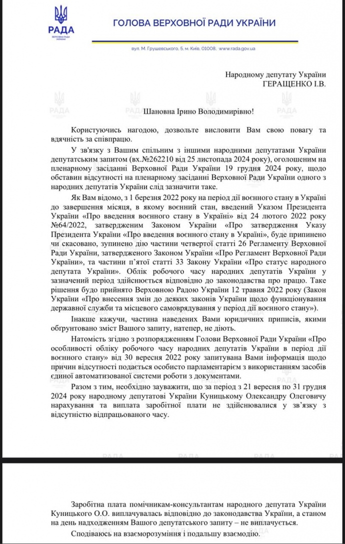Дослівно апарат ВР: "…необхідно зауважити, що за період з 21 вересня по 31 грудня 2024 року народному депутатові України Куницькому Олександру Олеговичу нарахування та виплата заробітної плати не здійснювалися у зв'язку з відсутністю відпрацьованого часу".