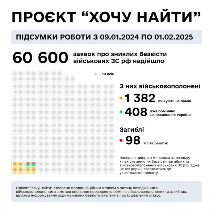 Дослівно: "Рекордна кількість запитів надійшла до проєкту "Хочу найти" в січні цього року. 8 548 заявок на пошук інформації про зниклих безвісти військовослужбовців армії країни-агресора було надіслано до проєкту".