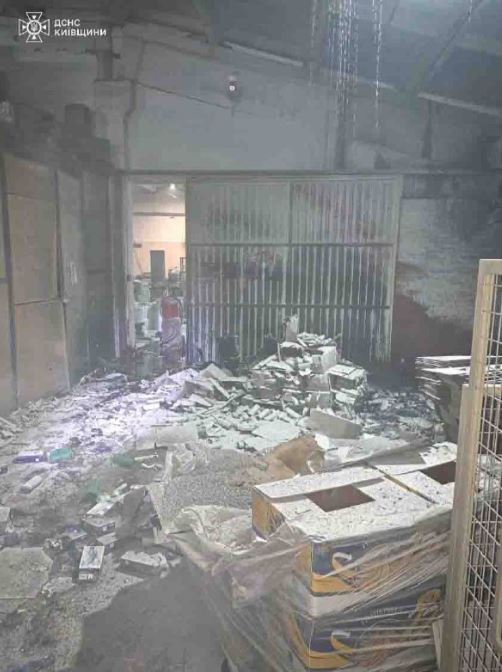 Дослівно: "Внаслідок ворожої атаки у Бориспільському районі сталося загоряння та руйнування покрівлі складського приміщення виробництва. Пожежа оперативно ліквідована. Також пошкоджений один приватний будинок.