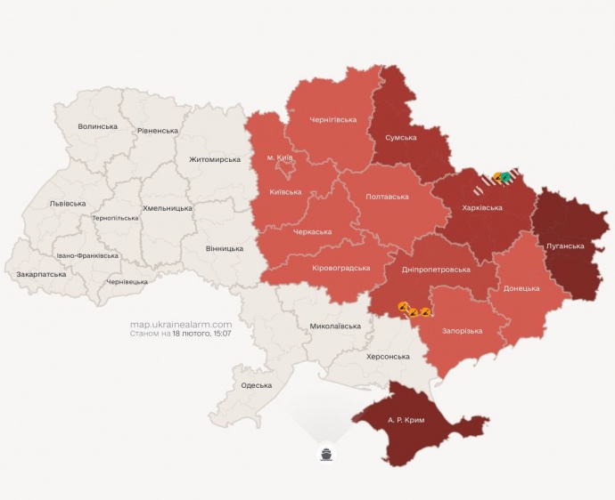 Вдень 18 лютого у Києві та низці областей оголошували повітряну тривогу через загрозу застосування балістики, яка тривала 27 хвилин.