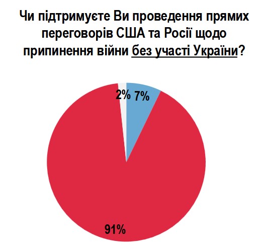91% опитаних українців категорично не сприймають переговори США і Росії щодо припинення війни без участі України.
