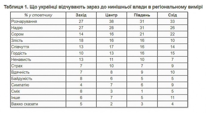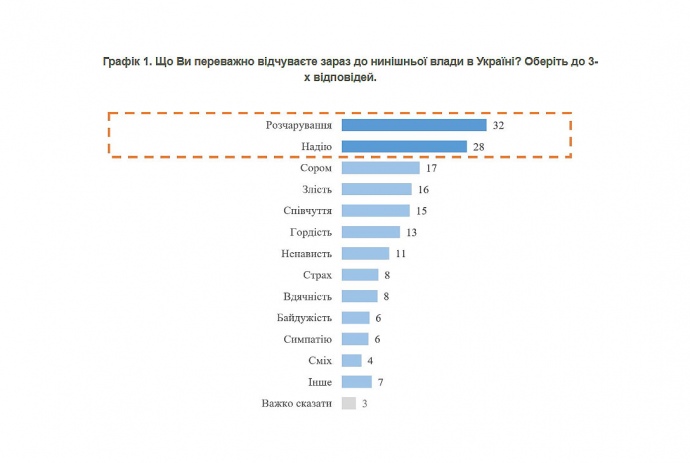 Дослівно КМІС: "Найбільше респондентів говорили про розчарування (32% серед усіх респондентів) і надію (28%). Далі йдуть такі відповіді, як сором (17%), злість (16%), співчуття (15%), гордість (13%), ненависть (11%)".
