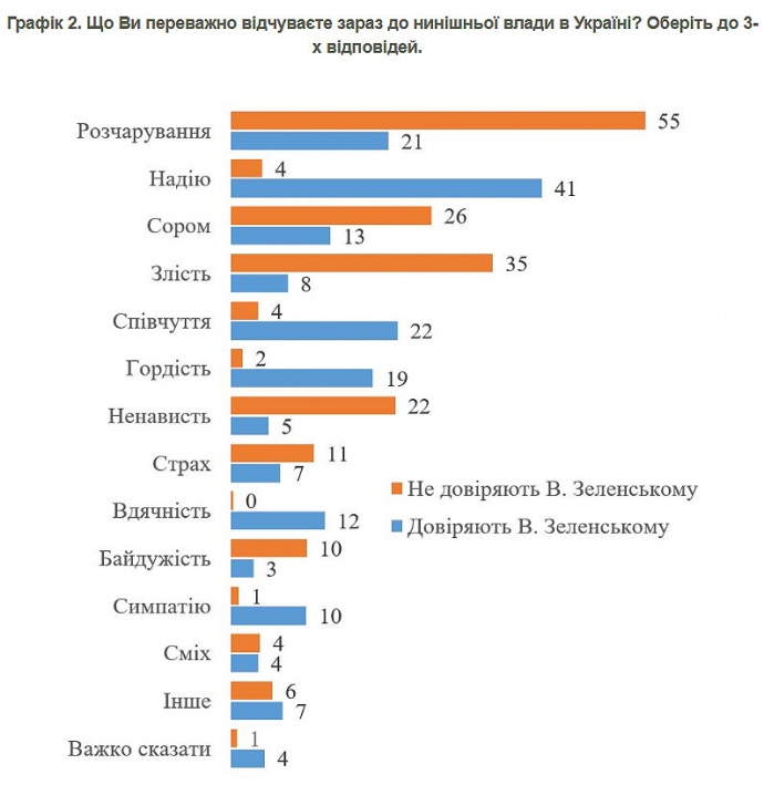 Деталі: Під час опитування респондентам ставили запитання "Що ви переважно відчуваєте зараз до нинішньої влади в Україні?". При цьому їм пропонували або обрати до 3 відповідей з переліку з 12 почуттів/емоцій, або назвати свій варіант.