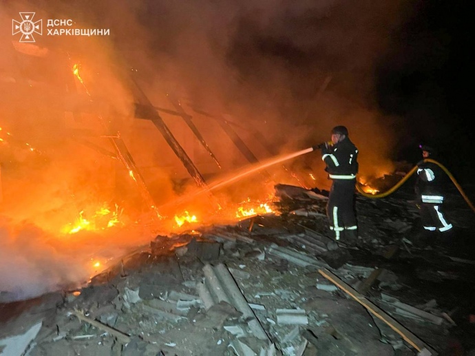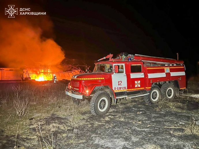 Дослівно служба: "Увечері 23 березня ворог атакував ударними БпЛА сільськогосподарське підприємство у селищі Великий Бурлук Куп'янського району. Внаслідок влучання дронів загорілася складська будівля".