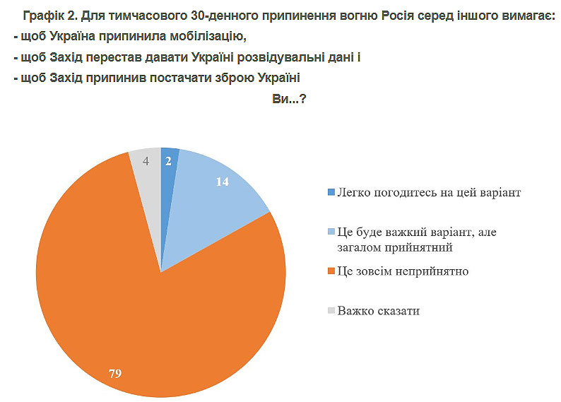 Дослівно КМІС: "Для абсолютної більшості українців – 79% – російські вимоги для припинення вогню є категорично неприйнятними. Готові прийняти їх – 16% (з яких для 14% це є важким варіантом)".