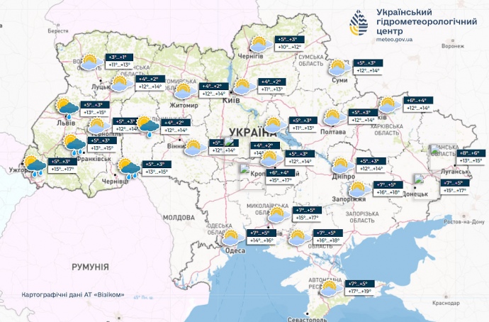 Деталі: У середу температура повітря вночі 0-7° тепла, вдень 9-16° тепла, на Закарпатті, в південних областях та Криму 15-19°. Вітер північно-західний з переходом на північно-східний, 3-10 м/с.