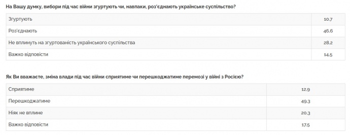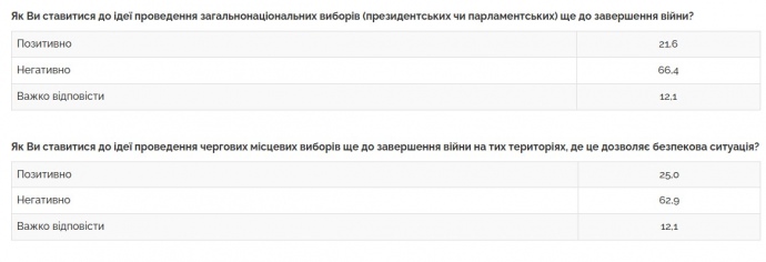 "Також переважно негативно громадяни ставляться до ідеї проведення чергових місцевих виборів ще до завершення війни на тих територіях, де це дозволяє безпекова ситуація — позитивне ставлення висловили лише 25% опитаних, а негативне — 63%".