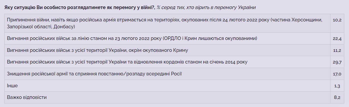 22% вважатимуть перемогою відновлення статус-кво станом на 23 лютого 2022 року, 11% – вигнання російських військ з усієї території України, окрім окупованого Криму.
