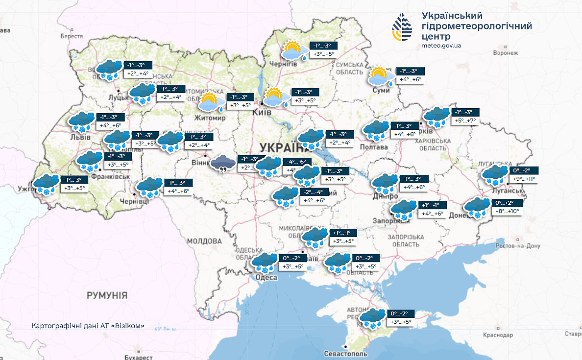 Найближчими днями в Україні очікується мокрий сніг, місцями значний сніг і заморозки, але від неділі прогнозують потепління до +18° і відсутність опадів.